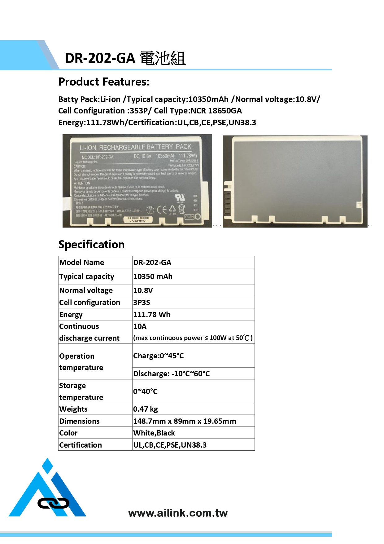 產品敘述: Batty Pack:Li-ion /Typical capacity:10350mAh /Normal voltage:10.8V/ Cell Configuration :3S3P/ Energy:111.78Wh/Certification:UL,CB,CE,PSE,UN38.3