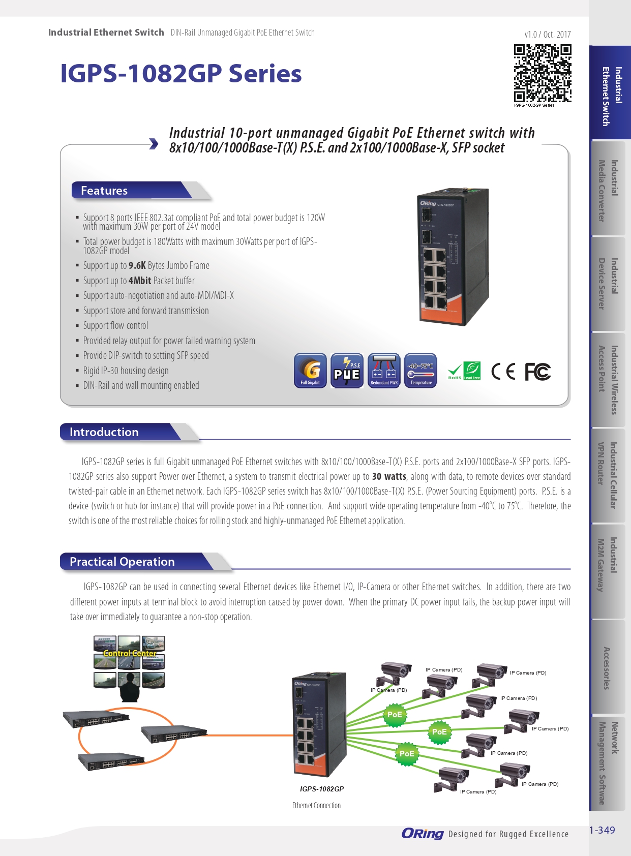 產品敘述: Support 8 ports IEEE 802.3at compliant PoE and total power budget is 120W with maximum 30W per port of 24V model Total power budget is 180Watts with maximum 30Watts per port of IGPS-1082GP model Support up to 9.6K Bytes Jumbo Frame Support up to 4Mbit Packet buffer Support auto-negotiation and auto-MDI/MDI-X